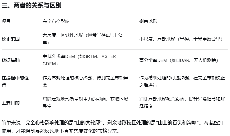 在常规地形校正之后,对于局部小尺度、高频率 的地形起伏(如沟壑、陡崖、孤立山包),由于DEM网格较粗或校正半径有限,它们的影响并未完全消除。剩余地形校正就是利用更高分辨率 的DEM(如LiDAR数据)和更小的校正半径,对这些残留影响做二次补偿。