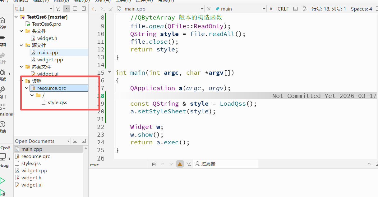 - style.qss 是需要程序运行时加载的. 为了规避绝对路径的问题, 仍然使⽤ qrc 的方式来组