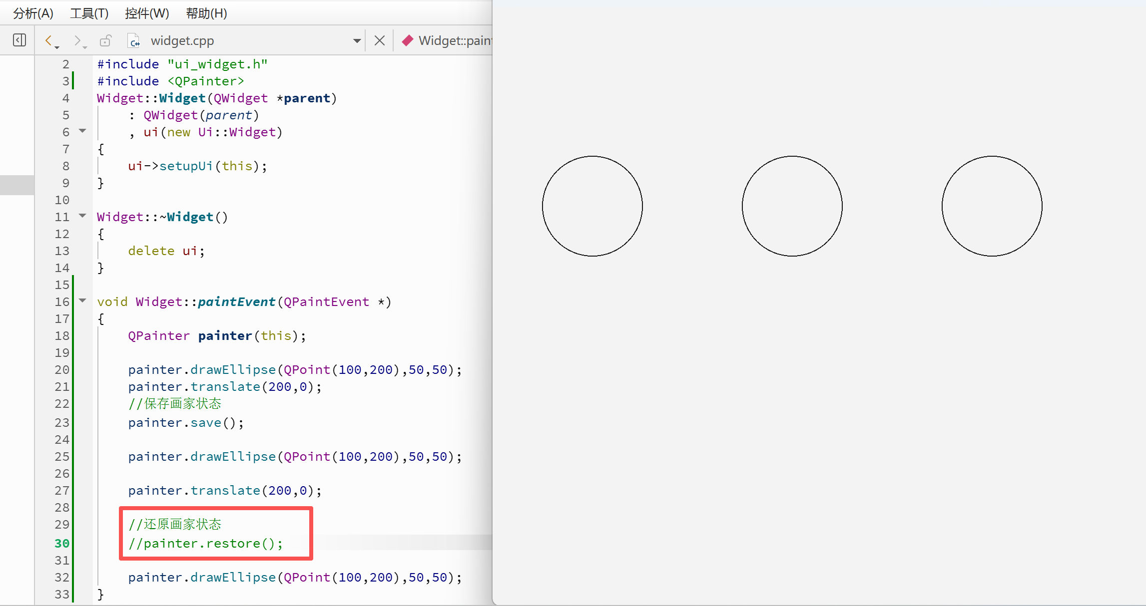 上述示例中,在画第三个圆之前,由于还原了画家的状态,所以此时画家的位置坐标会移动到画家状态保存的地方,所以在绘制第三个圆的位置时实际是和第⼆个圆发生了重叠。