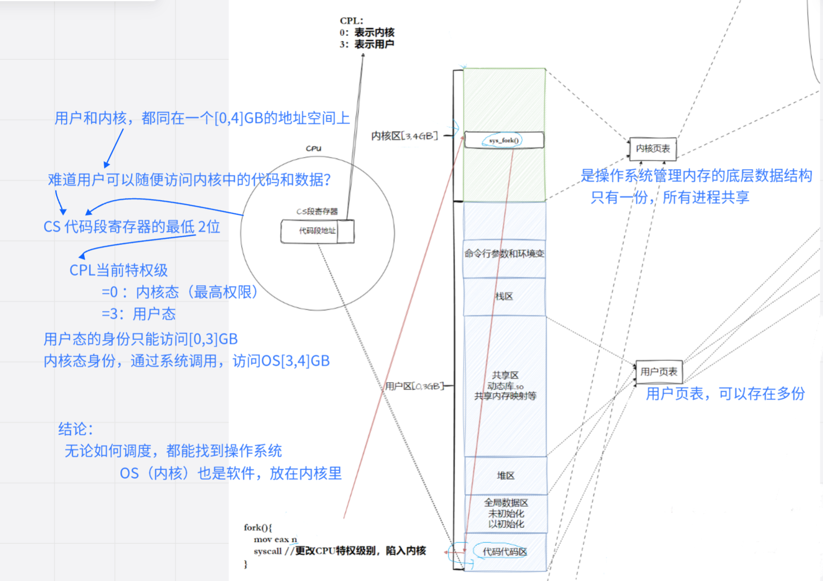 - 缺页中断、内存碎片、除零、野指针等异常,都会转为 CPU 内部软中断,由中断处理例程统一处理:有的负责申请内存、填充页表、建立映射,有的处理内存碎片,有的向进程发送信号并终止进程