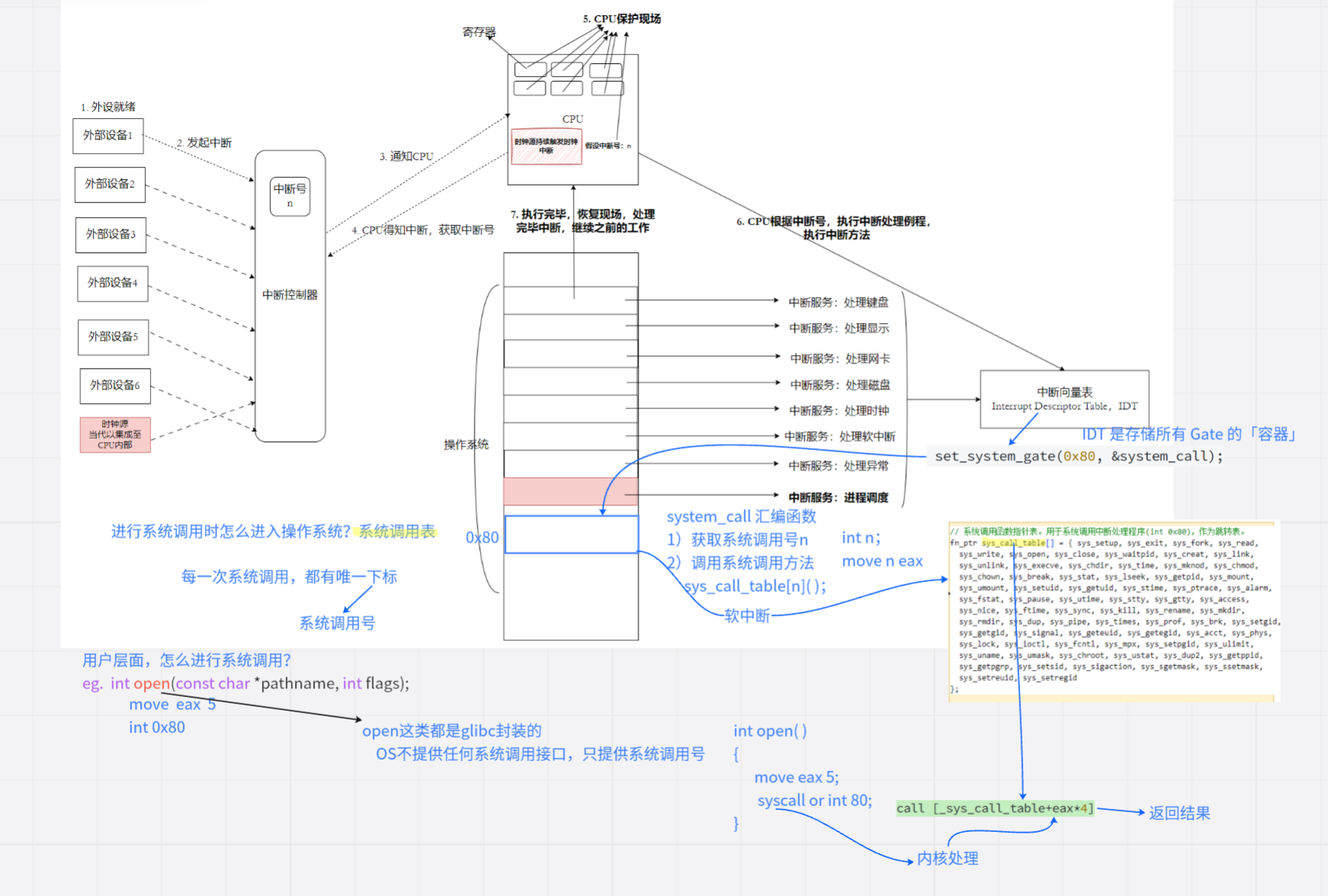 图上流程为: 用户态程序把系统调用号 n 存入eax,执行int 0x80触发软中断;CPU查中断向量表 IDT ,跳转到system_call总入口;system_call用 n 作为下标查系统调用表 sys_call_table,执行对应内核函数;最后把结果返回给用户态