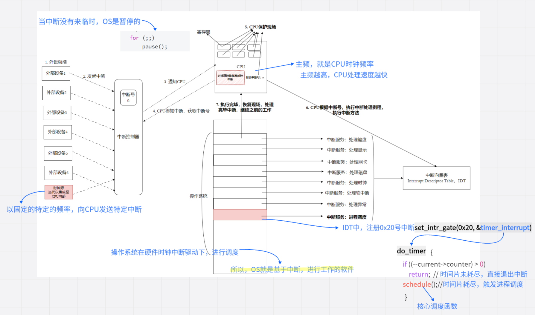- 操作系统就在硬件时钟的推动下,自动调度了
