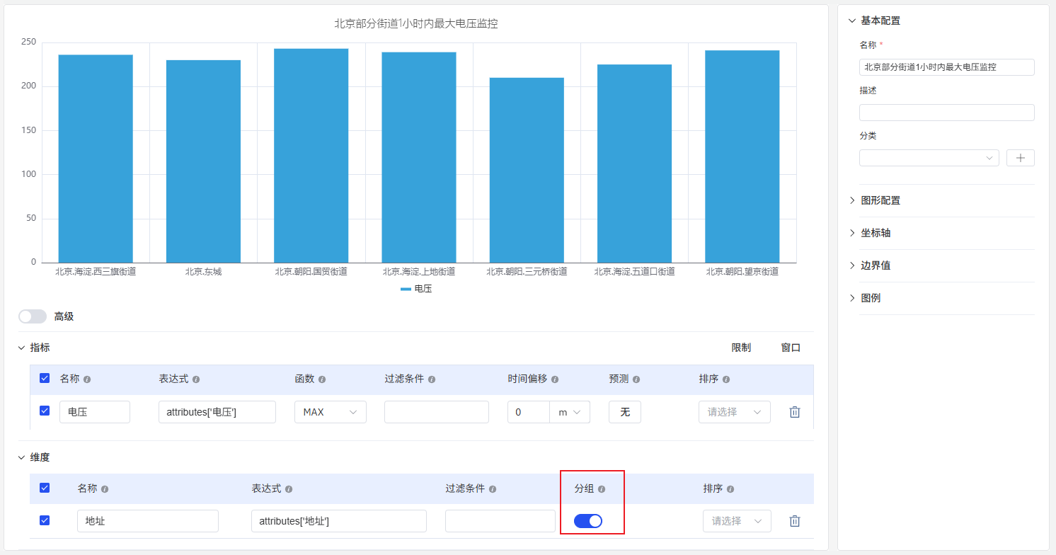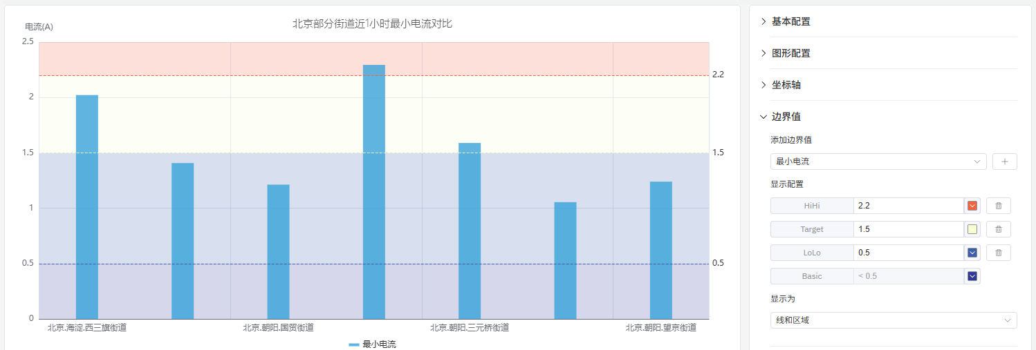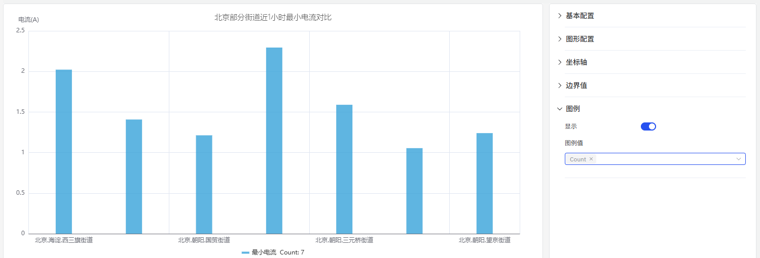 每个柱体对应一个聚合值:时间窗口内的总和、平均值或计数(如每小时能耗),或某一分类的值(如每条生产线的产量)。多个指标可以以分组或堆叠柱体的形式展示。