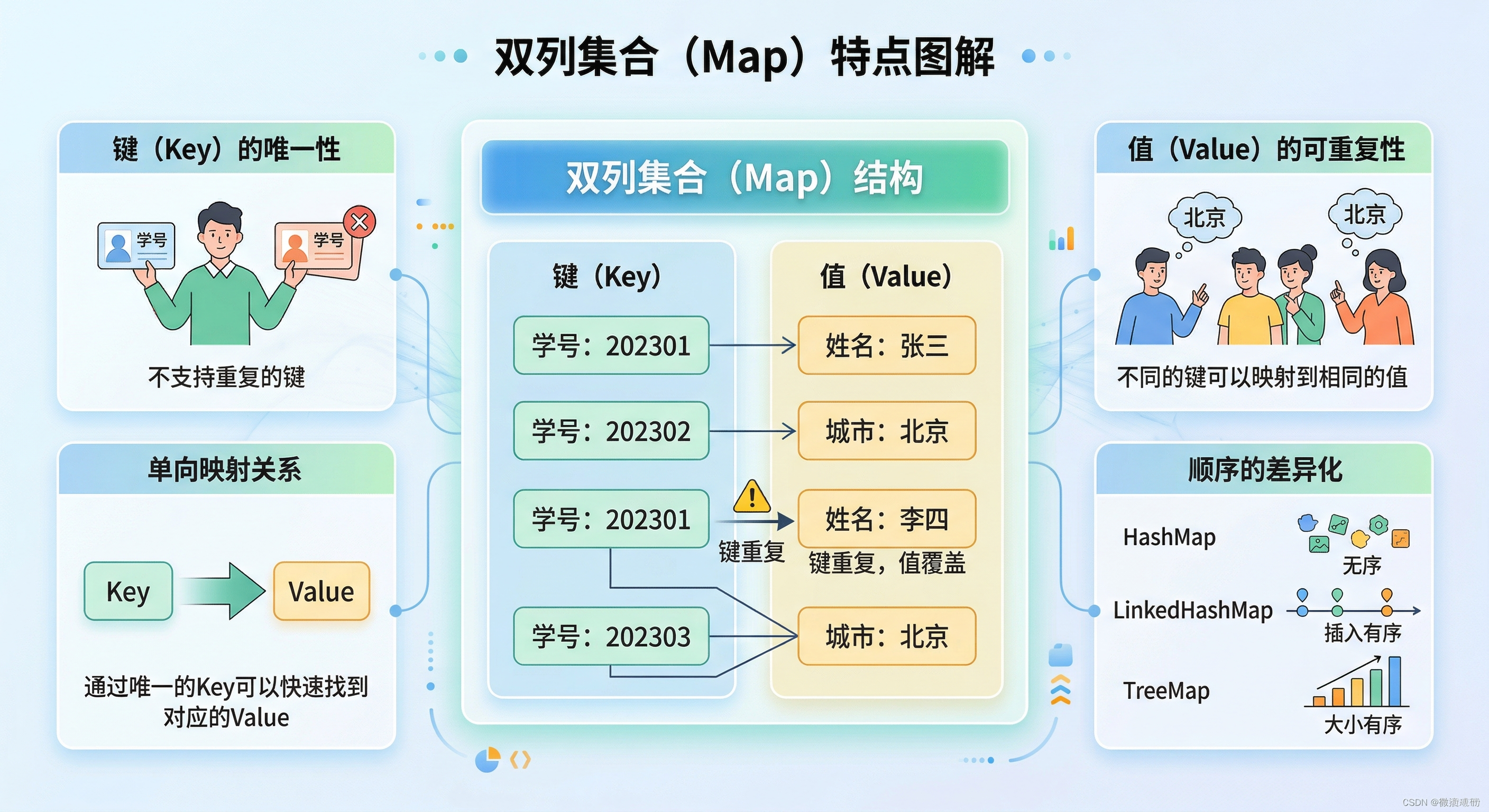 在之前学习了单列集合Collection接口,现在我们要学习的是Map双列集合,我们常说的双列集合 通常指的是基于 Map 接口实现的数据结构。与单列集合(如 List、Set,每次只存入一个独立元素)不同,双列集合每次存储的都是一对具有关联关系的数据。