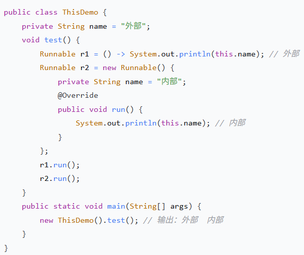 this指向外部类 对象,而不是 Lambda 本身(与匿名内部类不同)。匿名内部类中的this指向内部类实例。