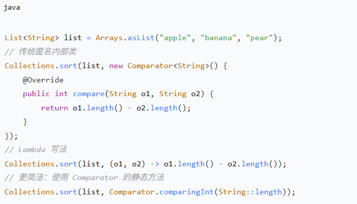 Lambda 表达式就是用 (参数) -> 表达式 这种写法,替代啰嗦的匿名内部类,让你能把一段行为(代码块)像数据一样传递,从而写出更简洁、更灵活、可读性更高的代码。
