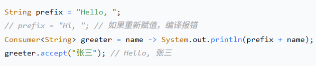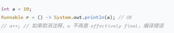 final,但必须实际不可变(effectively final)。 -