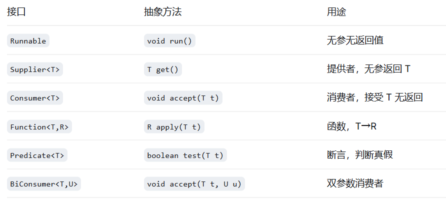 Java 8 为常见的函数式接口增加了 @FunctionalInterface 注解(可选,但建议加上,编译器会检查)。