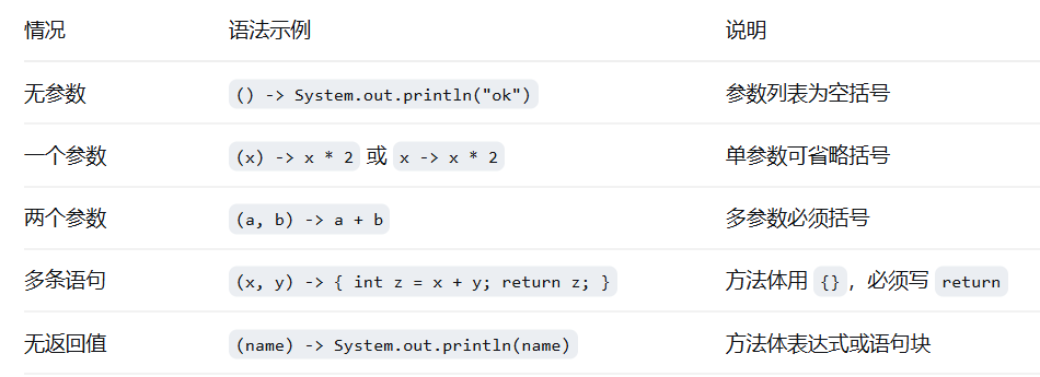 (参数列表) -> { 方法体 }