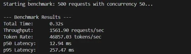 基准测试在真实负载条件下运行:并发数 50,共 500 个请求,每个生成 30 个 token,仅使用 CPU。
