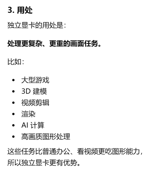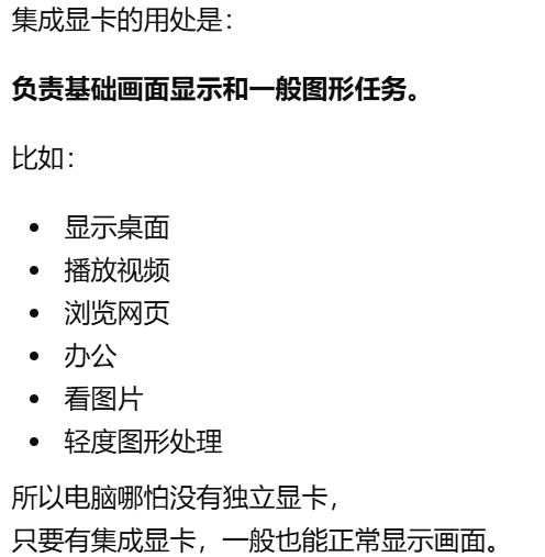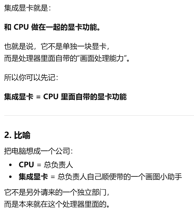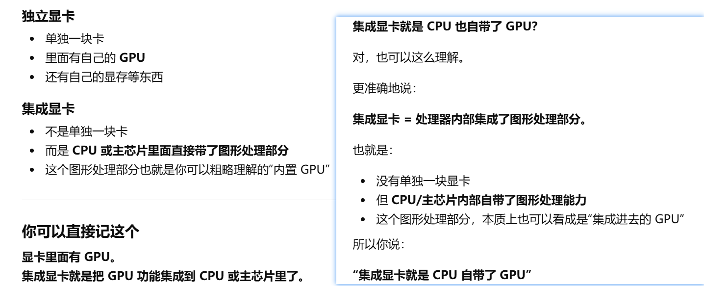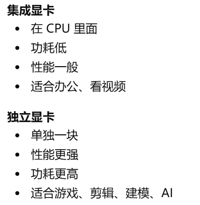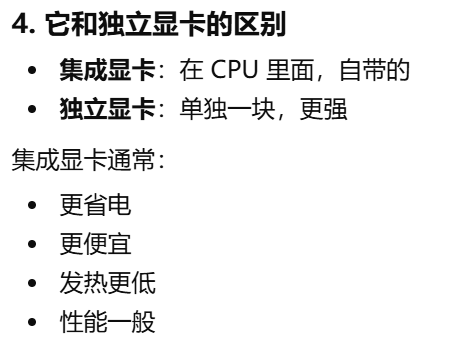 - [集成显卡和独立显卡区别。集成显卡:在 CPU 里面,自带的。独立显卡:单独一块,更强](#集成显卡和独立显卡区别。集成显卡:在 CPU 里面,自带的。独立显卡:单独一块,更强)