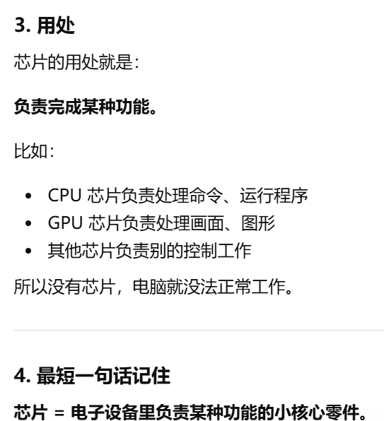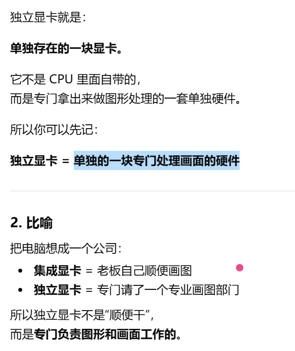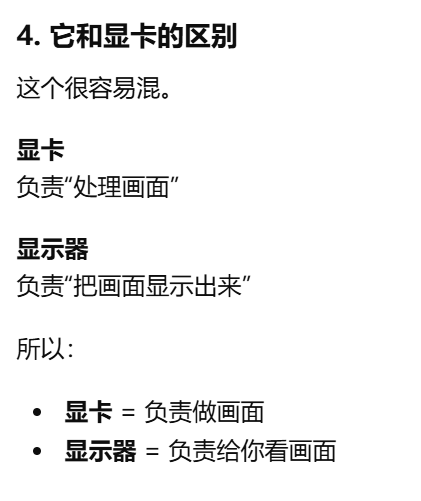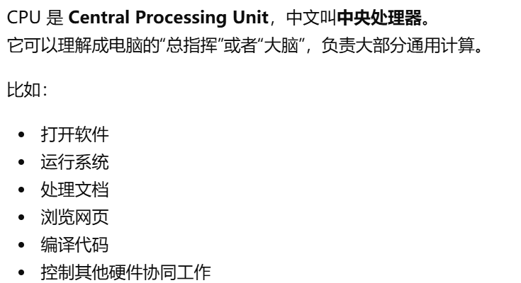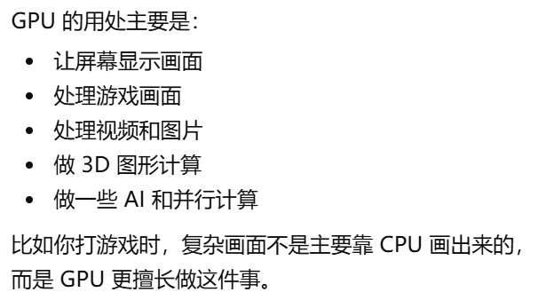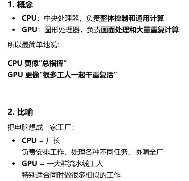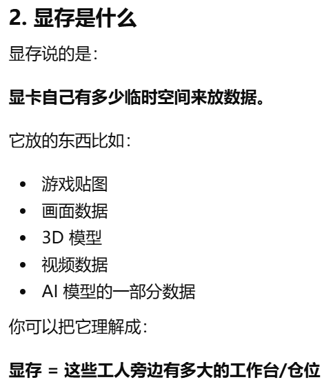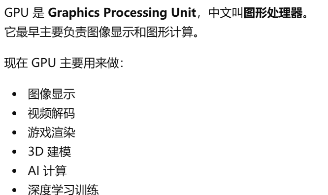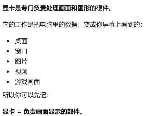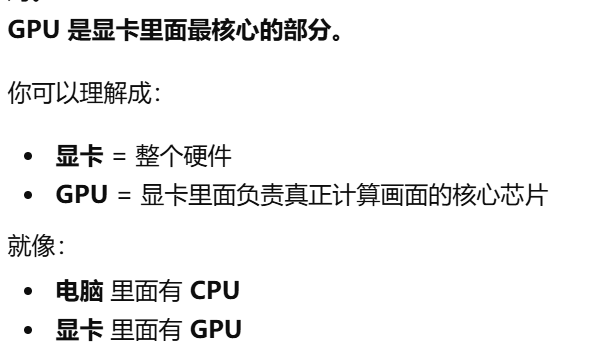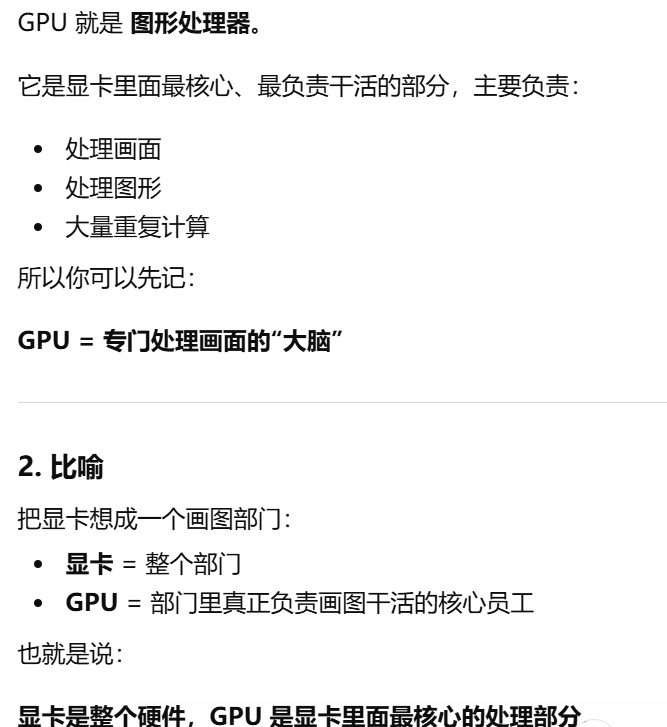 - [GPU 是 Graphics Processing Unit,中文叫图形处理器。GPU = 专门处理画面的"大脑",GPU 就是显卡里专门负责处理画面和图形的核心芯片](#GPU 是 Graphics Processing Unit,中文叫图形处理器。GPU = 专门处理画面的“大脑”,GPU 就是显卡里专门负责处理画面和图形的核心芯片)