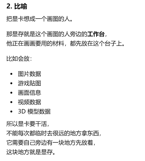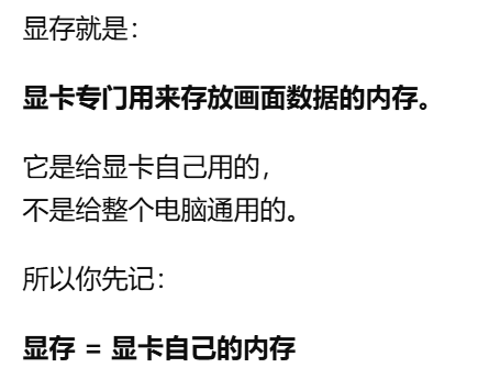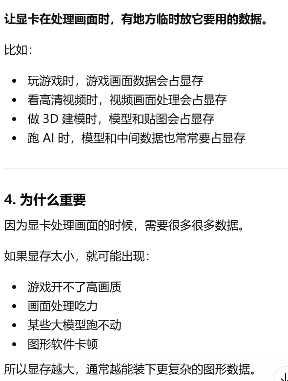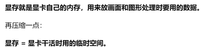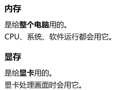 - [显存 显卡自己的内存,用来放画面和图形处理时要用的数据](#显存 显卡自己的内存,用来放画面和图形处理时要用的数据)