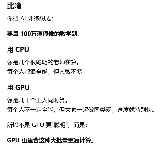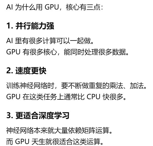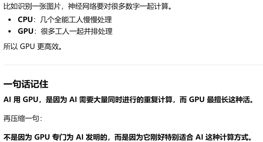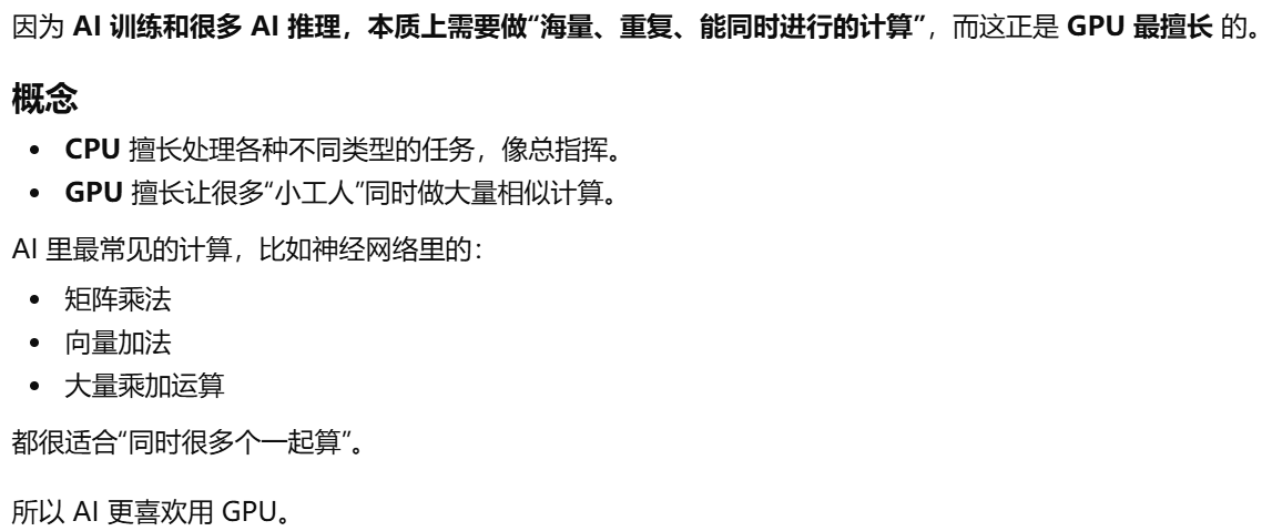 - [AI 训练和很多 AI 推理,本质上需要做"海量、重复、能同时进行的计算",而这正是 GPU 最擅长 的(简单重复)](#AI 训练和很多 AI 推理,本质上需要做“海量、重复、能同时进行的计算”,而这正是 GPU 最擅长 的(简单重复))