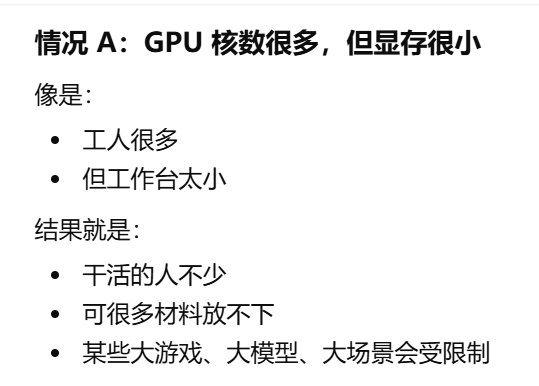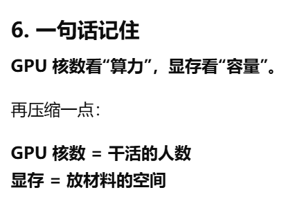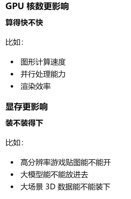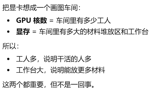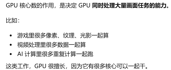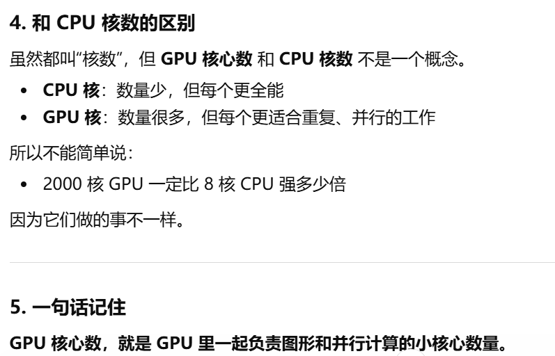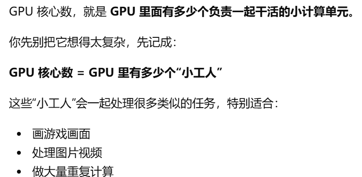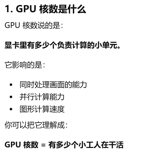 - [gpu核数,GPU 里面有多少个负责一起干活的小计算单元。决定 GPU 同时处理大量画面任务的能力](#gpu核数,GPU 里面有多少个负责一起干活的小计算单元。决定 GPU 同时处理大量画面任务的能力)