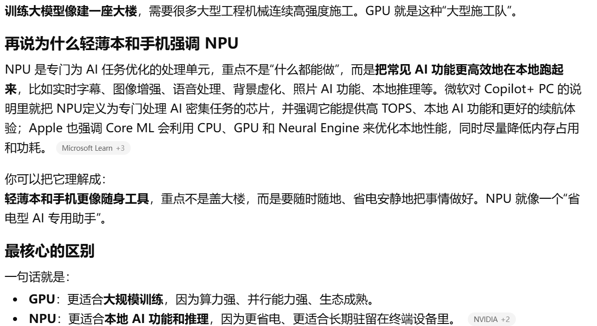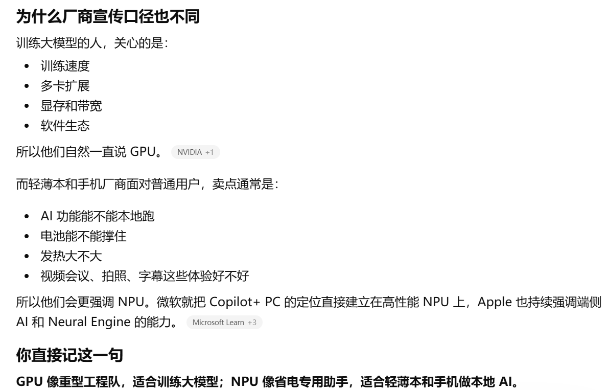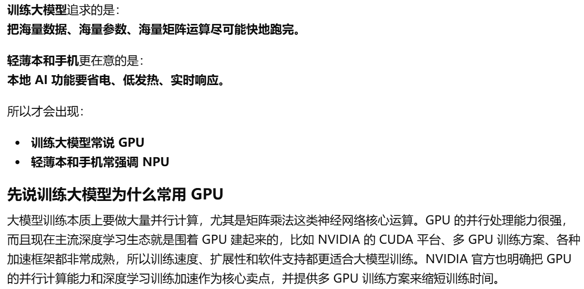 - [为什么训练大模型常说 GPU,而轻薄本和手机又总强调 NPU。](#为什么训练大模型常说 GPU,而轻薄本和手机又总强调 NPU。)