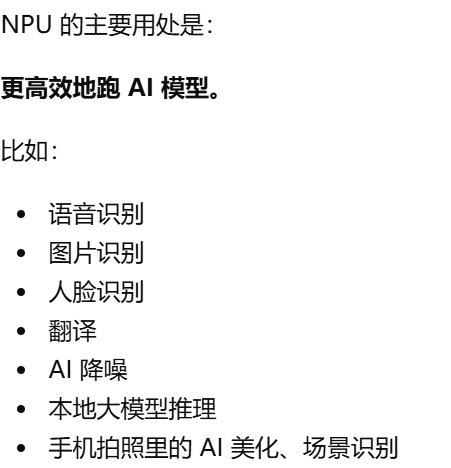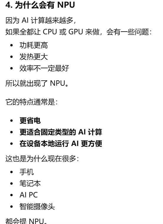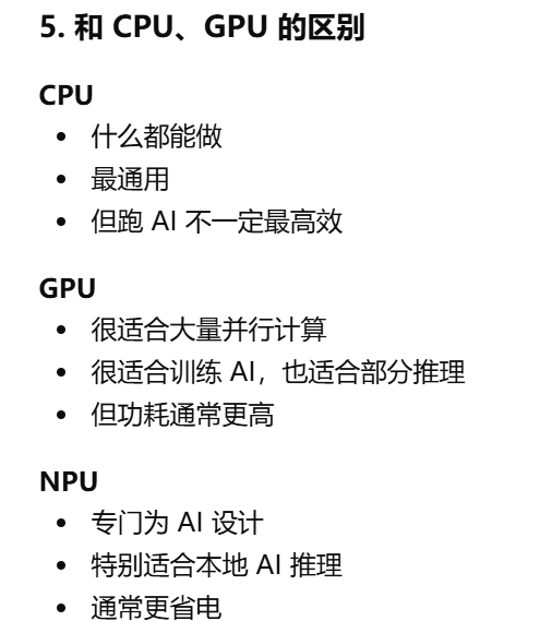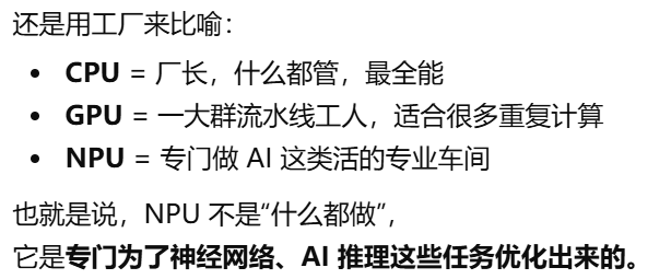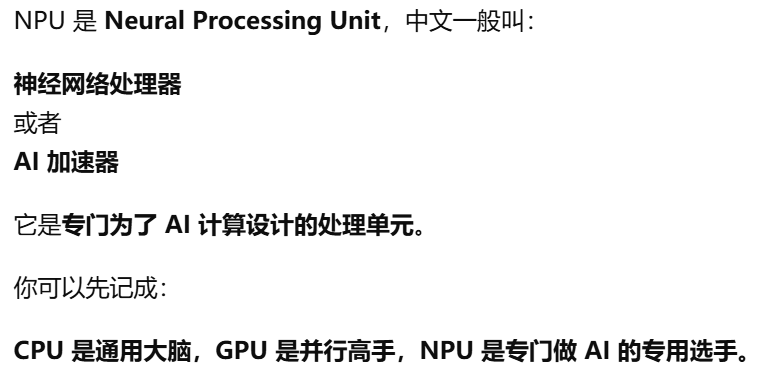- [和cpu gpu的区别。CPU 是万能选手,GPU 是大规模并行选手,NPU 就是 AI 专项选手](#和cpu gpu的区别。CPU 是万能选手,GPU 是大规模并行选手,NPU 就是 AI 专项选手)