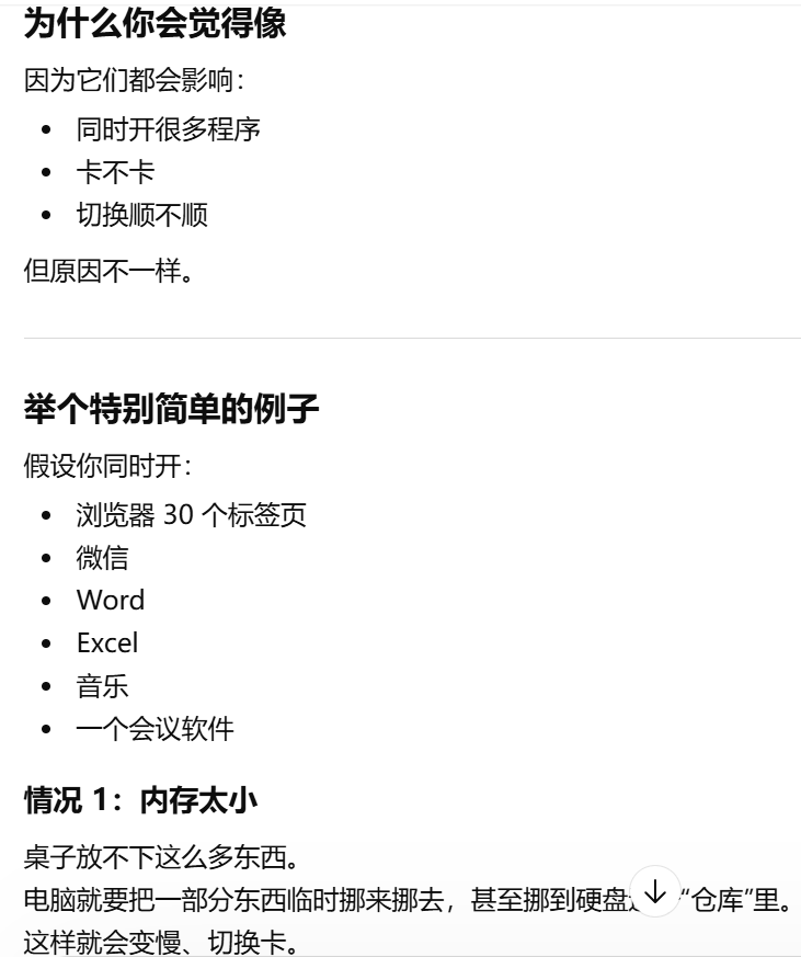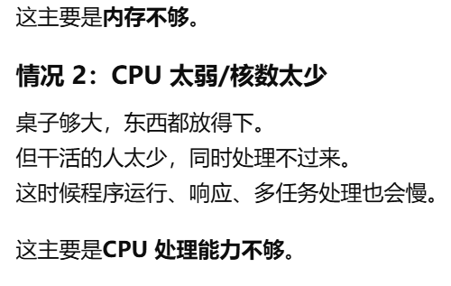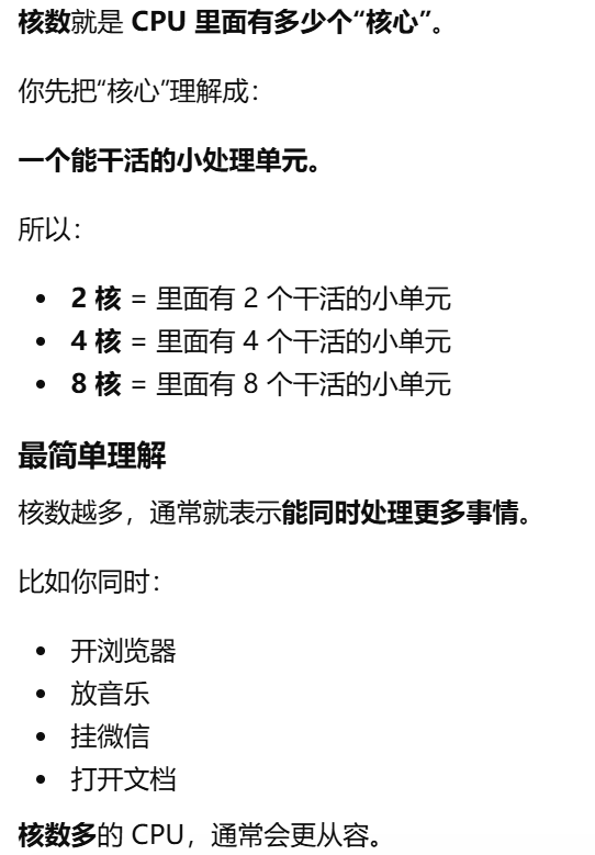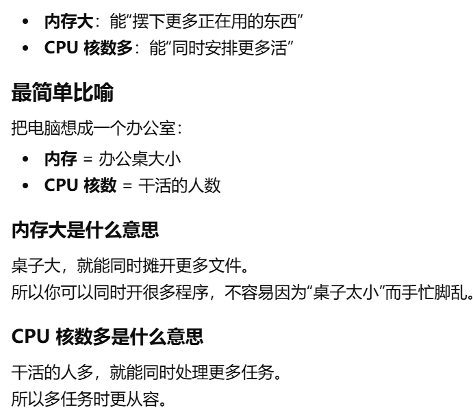 - [内存大:能"摆下更多正在用的东西",CPU 核数多:能"同时安排更多活"](#内存大:能“摆下更多正在用的东西”,CPU 核数多:能“同时安排更多活”)