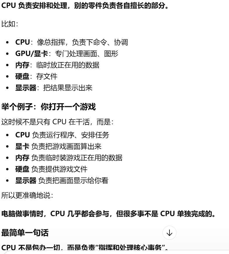 CPU 不是包办一切,而是负责"指挥和处理核心事务"