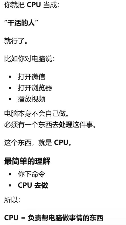 - [CPU 是 Central Processing Unit, 中央处理器。干活的人](#CPU 是 Central Processing Unit, 中央处理器。干活的人)