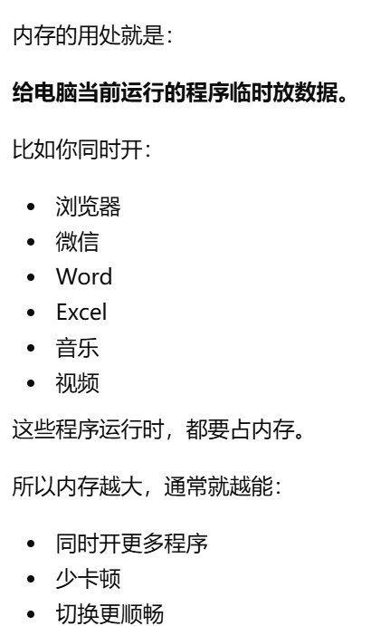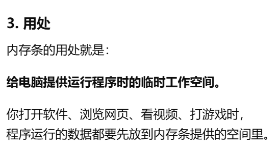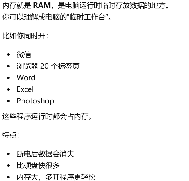 - [内存就是 RAM,是电脑运行时临时存放数据的地方](#内存就是 RAM,是电脑运行时临时存放数据的地方)