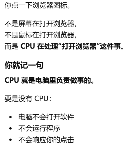 负责"做事"和"指挥"的东西,没有 CPU,电脑就不会工作