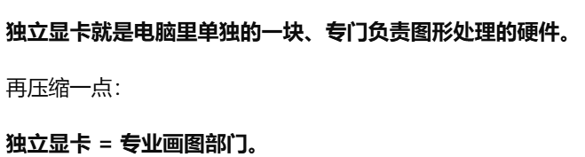 - 独立显卡,独显。单独的一块专门处理画面的硬件。独立显卡就是电脑里单独的一块、专门负责图形处理的硬件