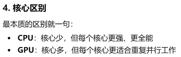 cpu 和 gpu 的区别,CPU:中央处理器,负责整体控制和通用计算,GPU:图形处理器,负责画面处理和大量重复计算