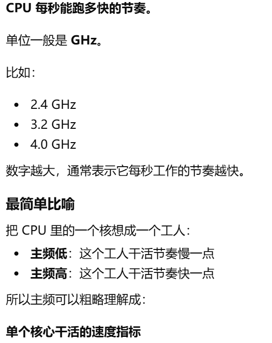 - [主频,CPU 干活快慢的一个数值,单位一般GHz。单个核心干活的速度指标](#主频,CPU 干活快慢的一个数值,单位一般GHz。单个核心干活的速度指标)