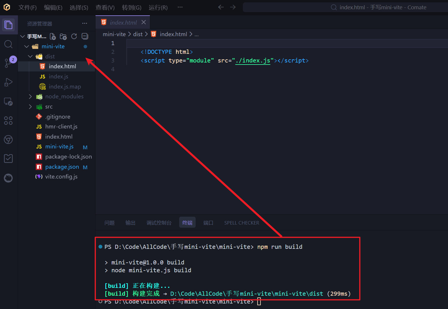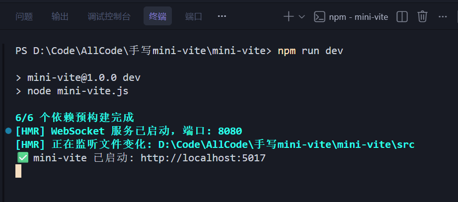 我们在开发模式下启动vite服务器,运行的是 npm run dev,实际上就是执行的 node .\mini-vite.js,对其官方,我们将node .\mini-vite.js配置到package.json的script中,使得mini-vite也可以使用 npm run dev启动