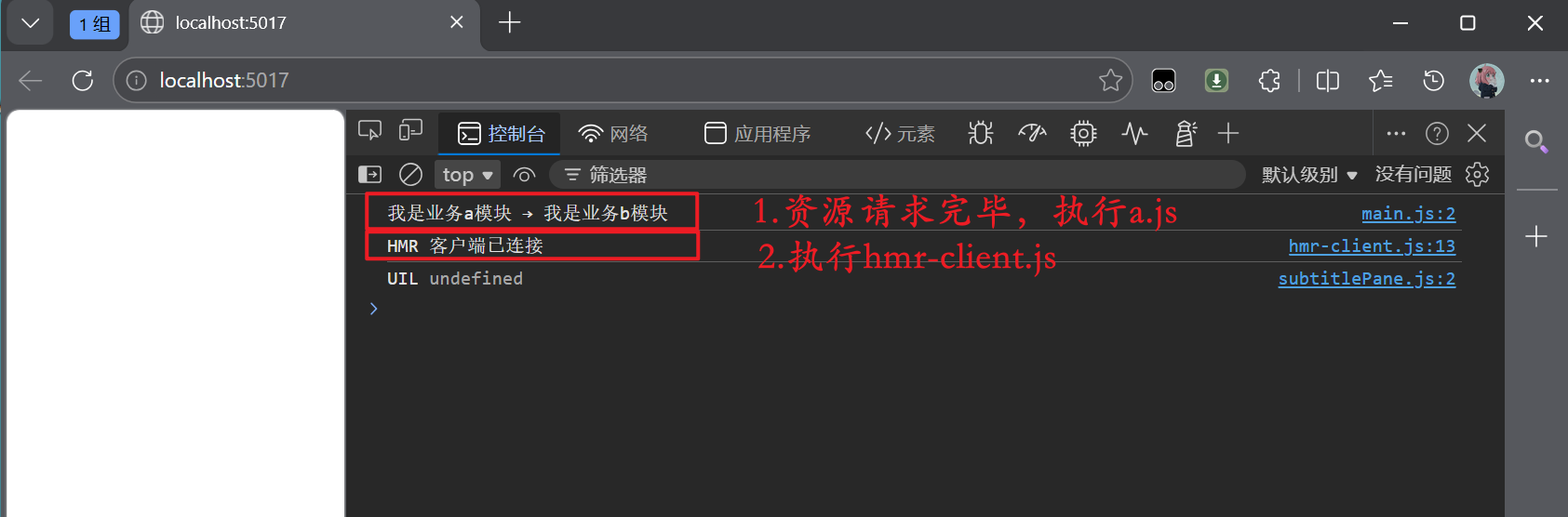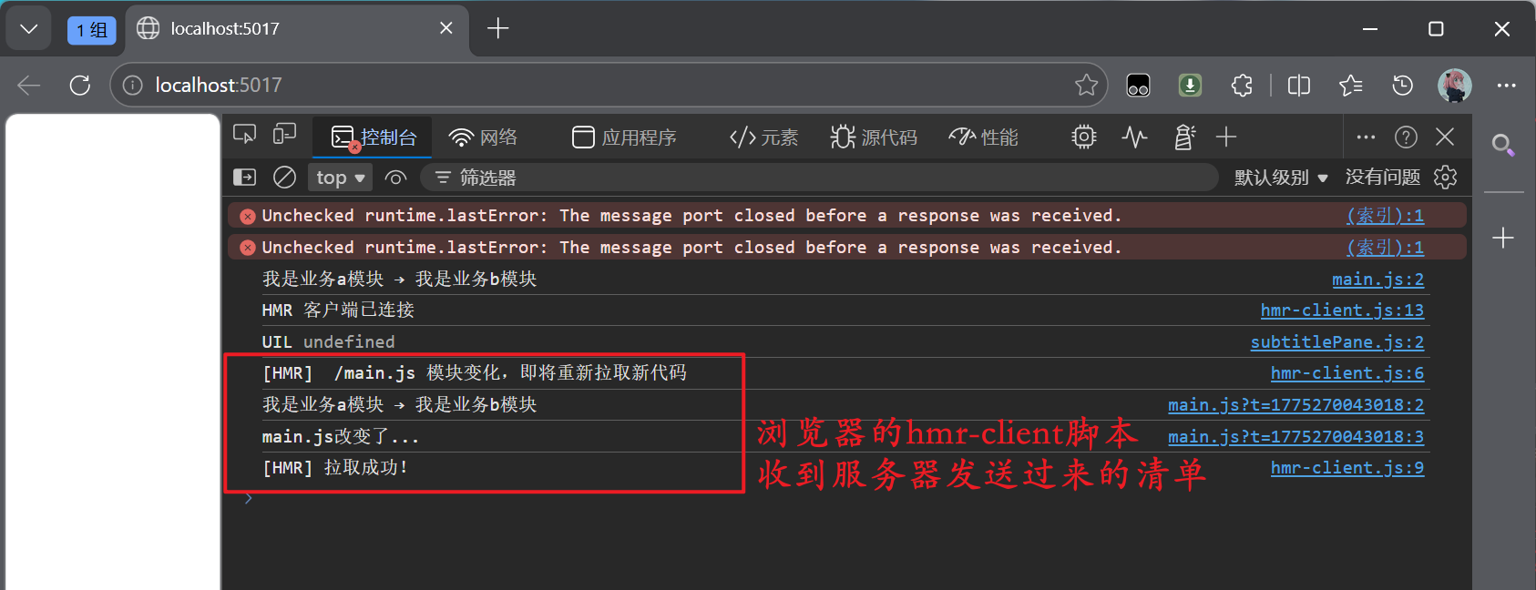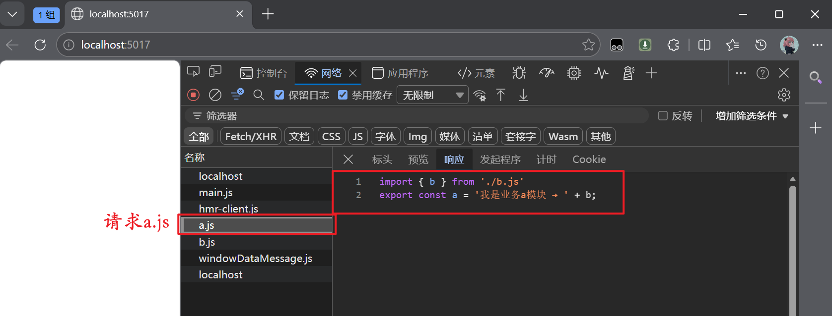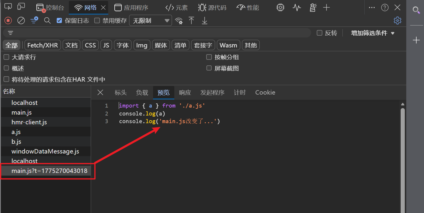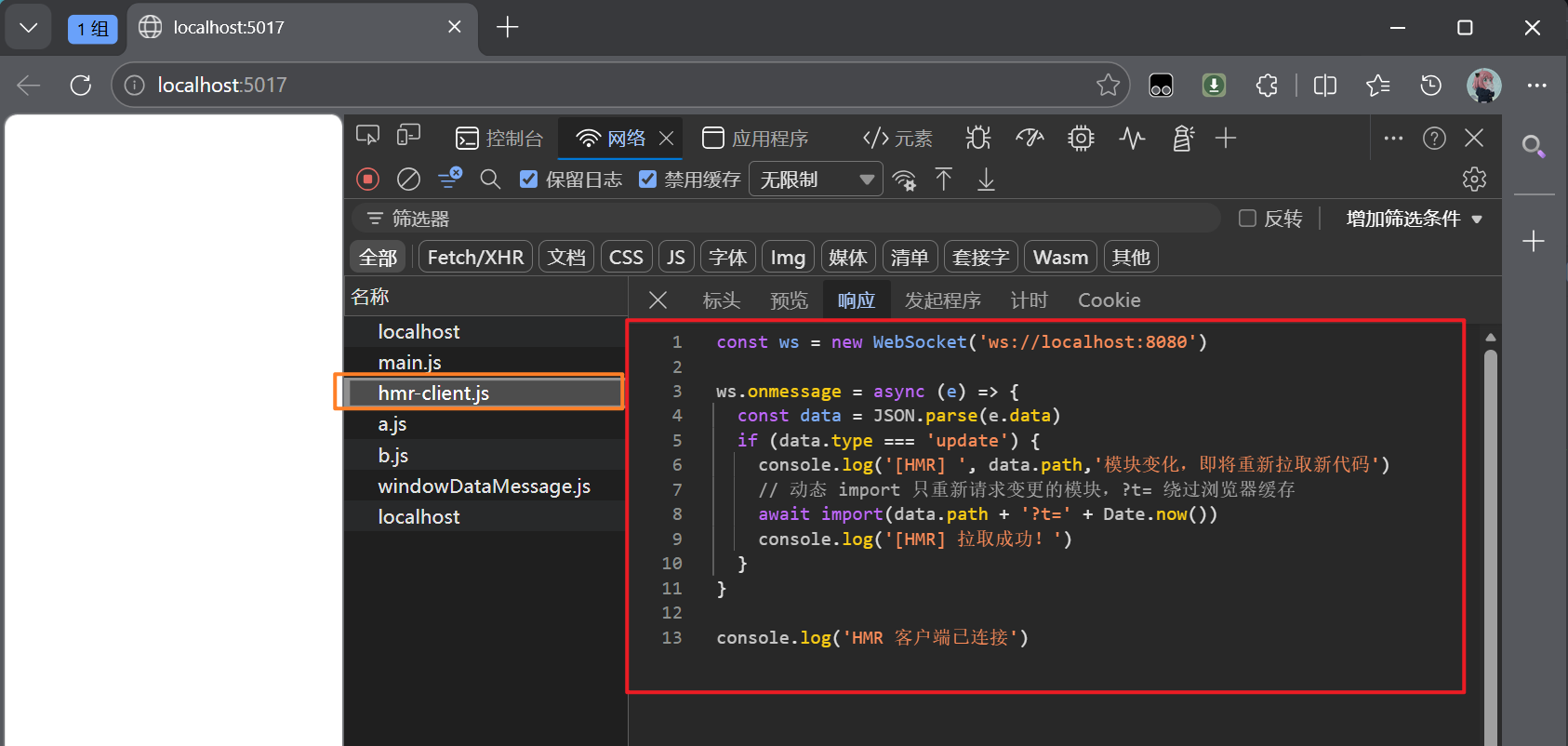 这里有一个细节点:我们发现,在请求完main.js 后,浏览器并没有继续请求a.js ,而是直接请求hmr-client.js,这是怎么回事呢?