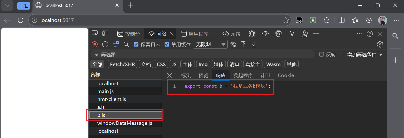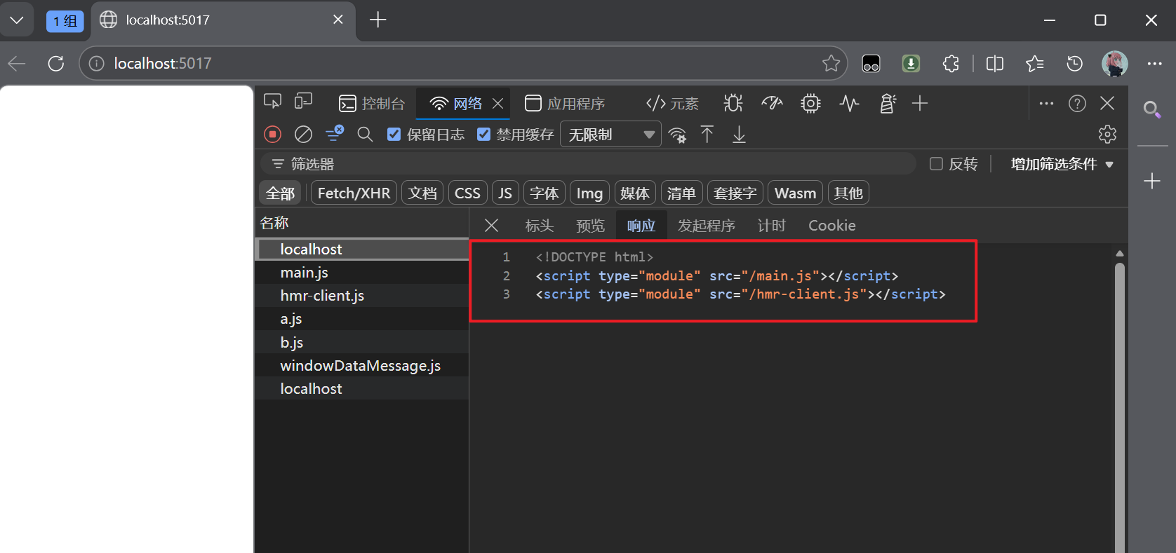 启动 node .\mini-vite.js,并在浏览器中打开http://localhost:5017,此时的请求路径为 ' / ',于是将index.html的内容响应给浏览器。