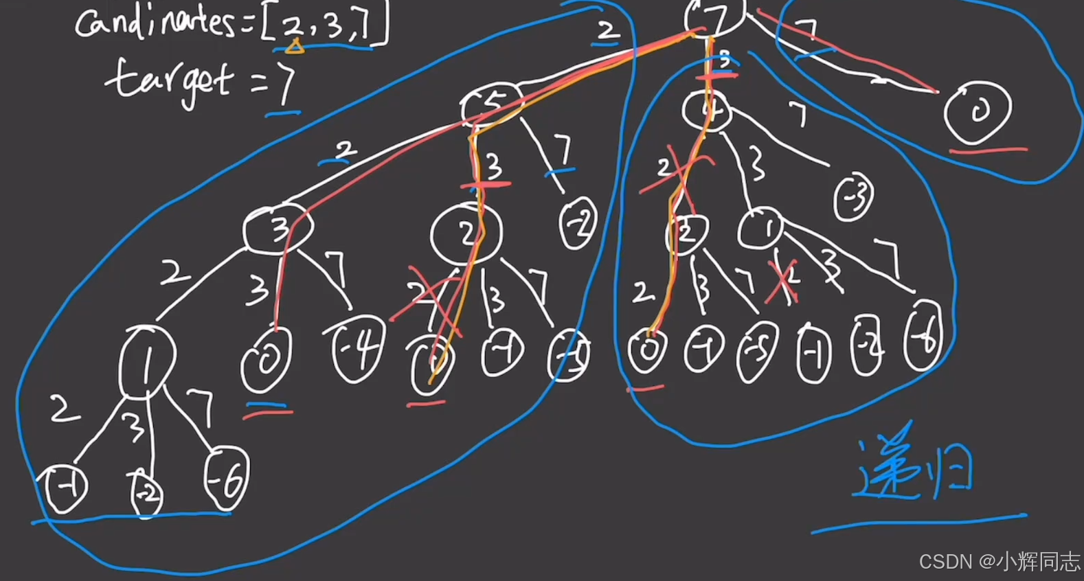 2 和 3 可以形成一组候选,2 + 2 + 3 = 7 。注意 2 可以使用多次。