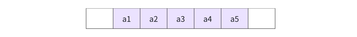 线性表的顺序存储就是顺序表,如果下图中的方格代表内存中的存储单元,那么存储顺序表中a1~a5这个5元素就是放在连续的位置上: