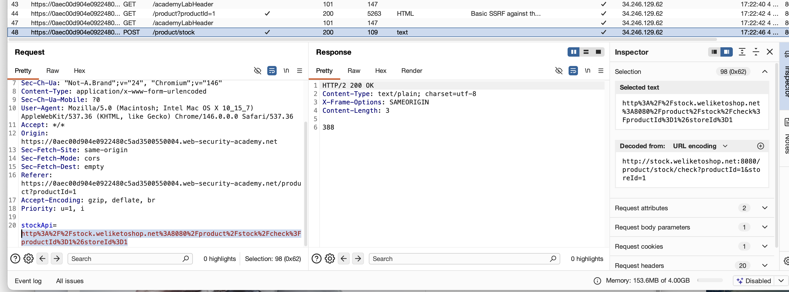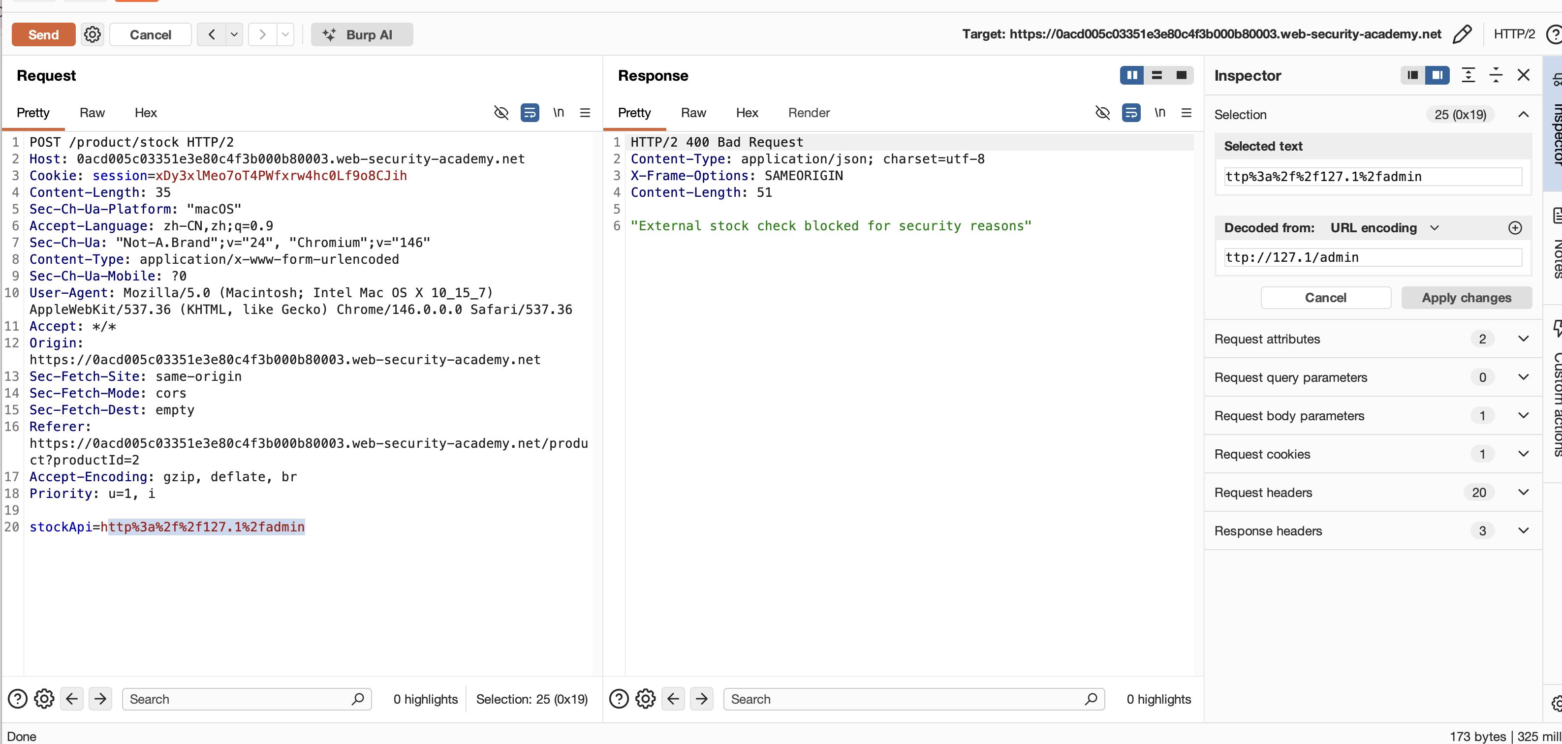 进入Lab环境,同样通过商品Check的这个点进行注入,经过尝试我们确定这个是白名单限制,也就是说发送的域名必须是stock.weliketoshop.net,那么从表面来看这或许是完美无缺的限制,但是由于URL存在双重编码,也就是说URL校验时也就是触发限制时会将URL中的编码解析,如果通过在请求时会再次进行解析,而校验器先校验的情况下,我们利用@ 语法,构建一个: