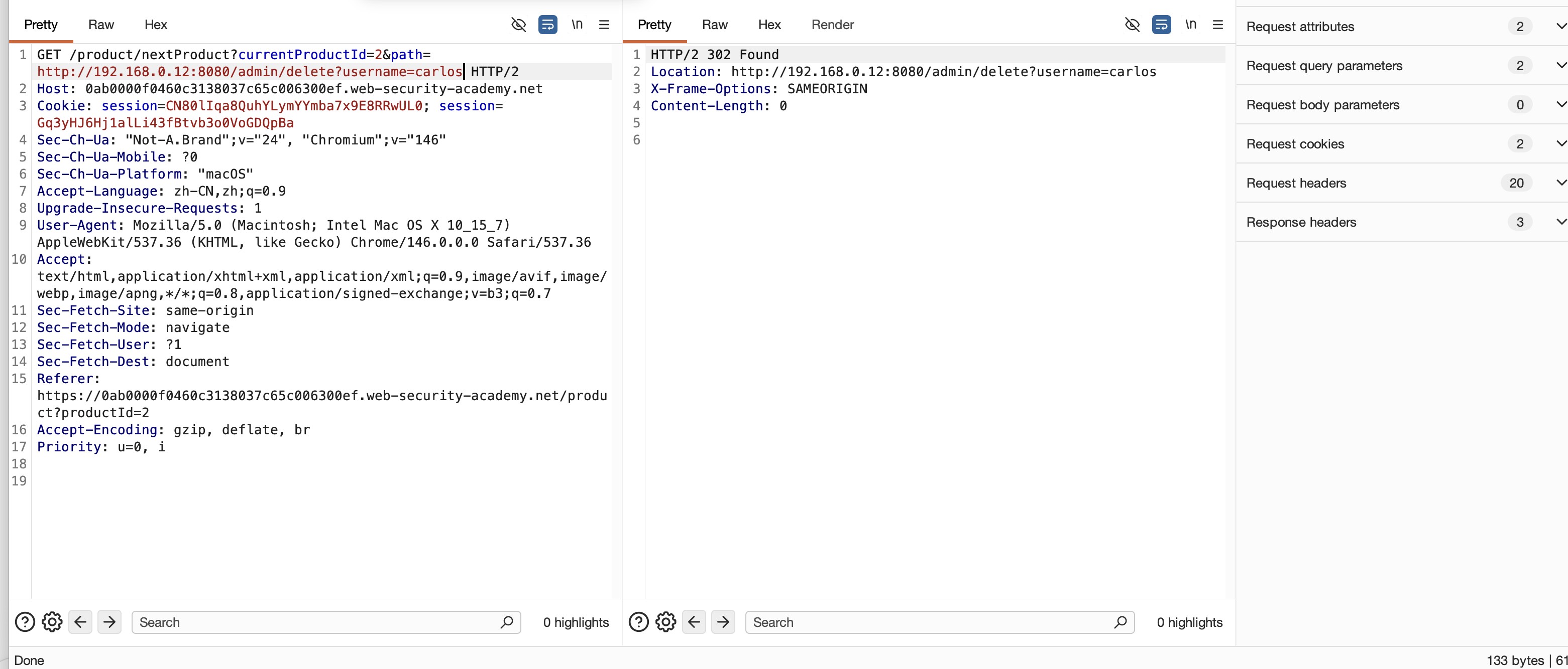 可以看到请求的当前网站的nextProduct,而它又回重定向到Path参数值的位置,我们就可以利用这个重定向,让目标请求nextProduct时,重定向到我们需要请求的/admin中,实现利用重定向绕过限制达成攻击内网的效果。
