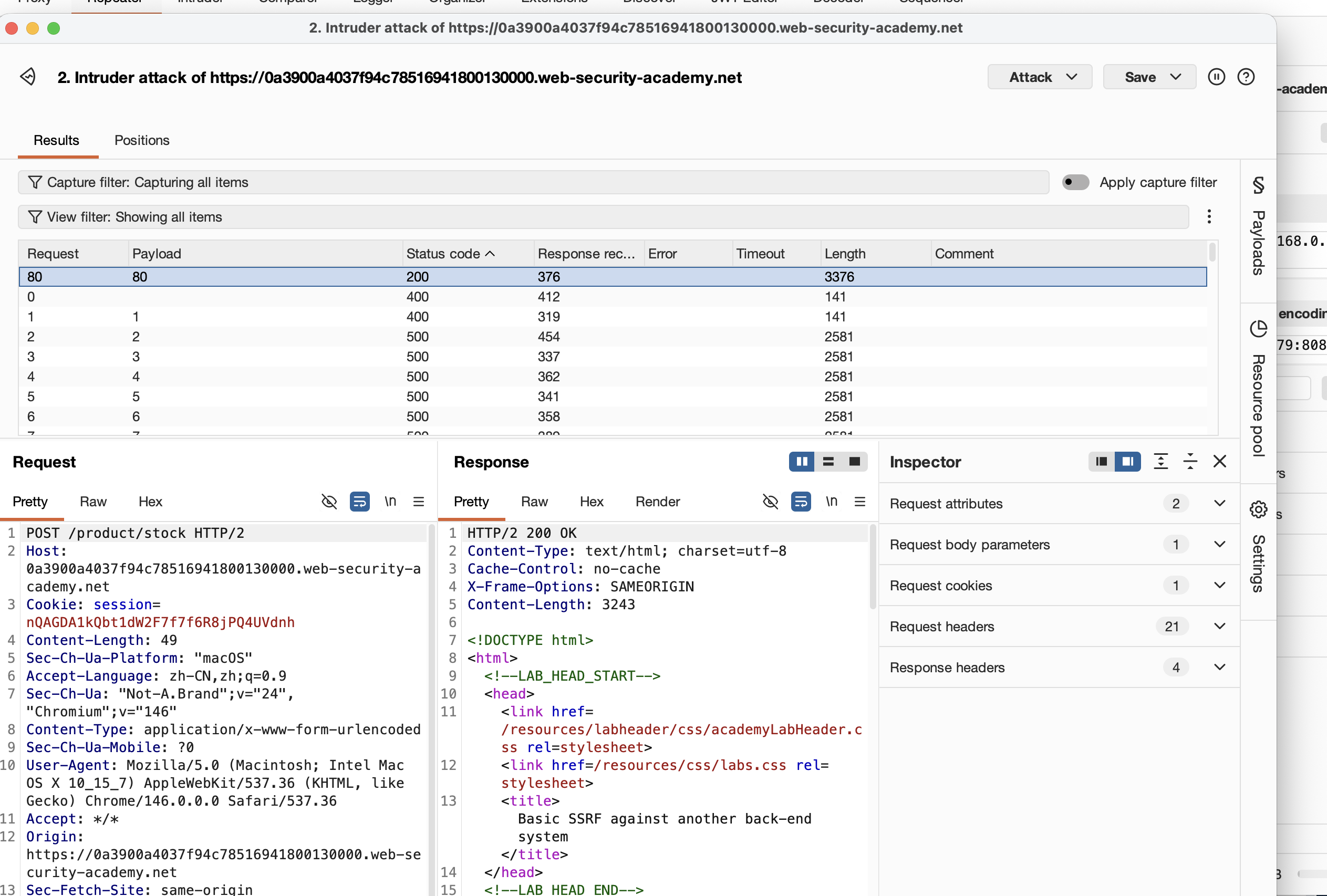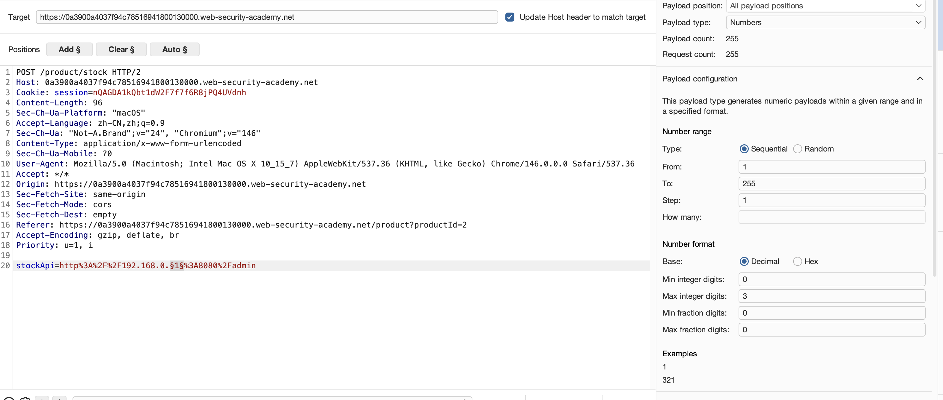 这个Lab同样没有对请求的目标URL做任何限制,执行过程与上述完全一致,不过这个Lab的/admin,并不在目标服务器的本地,也就是无论是127.0.0.1还是localhost等是无法直接请求到目标的/admin,不过我们顺利的得到了目标内网范围:192.168.0.X:8080,我们可以直接使用模糊测试,测试1-255看看那个IP正确处理了我们的请求,进而就可以同上述的Lab一样处理了。