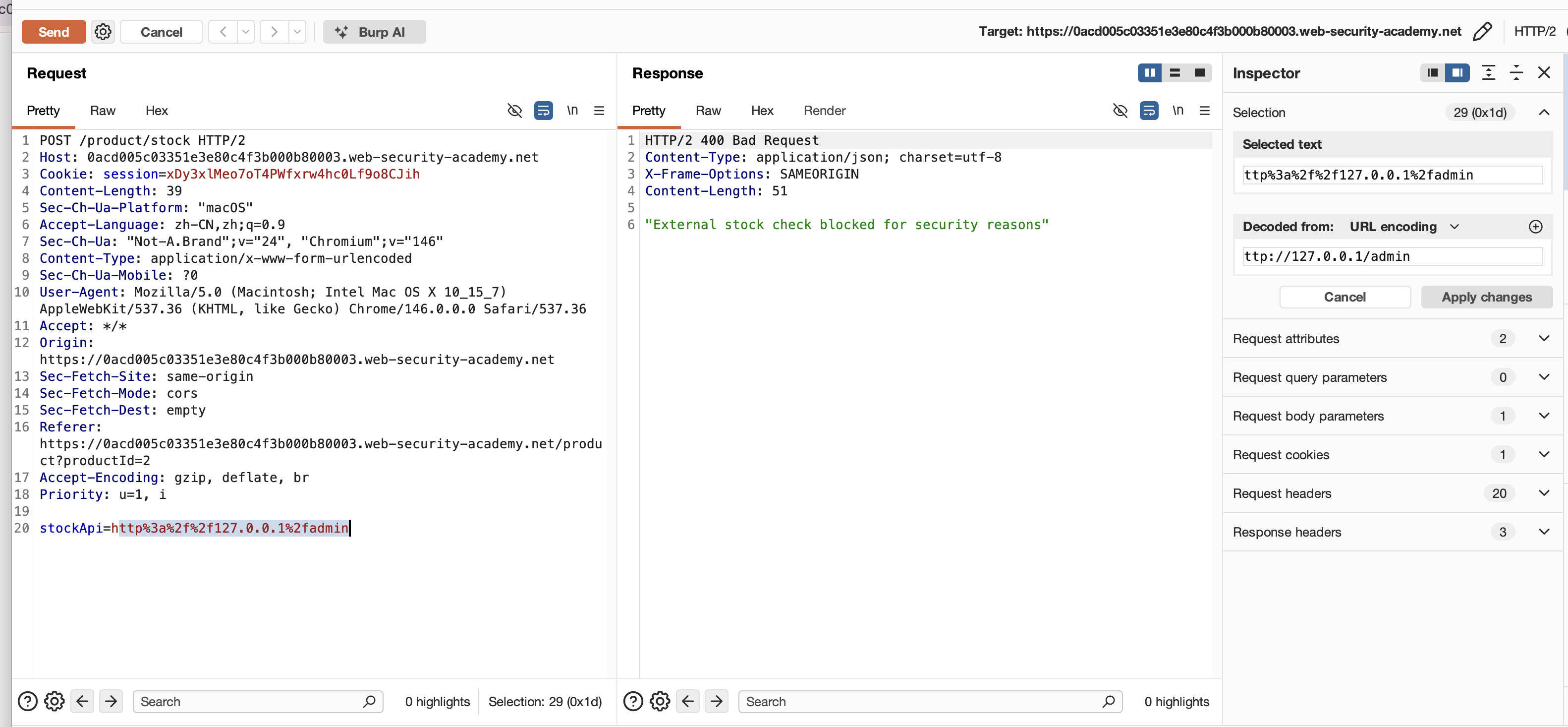 这是通过黑名单绕过的Lab,通常为了安全服务端会对可能存在SSRF风险的参数位置加一些限制,如:防止127.0.0.1/localhost/0.0.0.0,因为本地的回环地址可以合法的访问所有本地服务,就会出现这样的限制,再者就是对整个URL的敏感字符限制,如admin、root等。