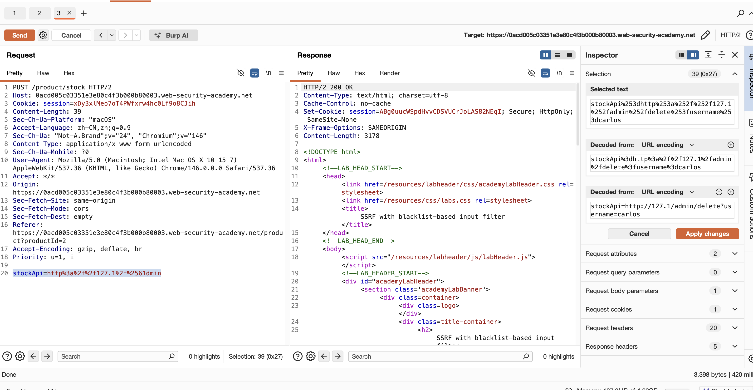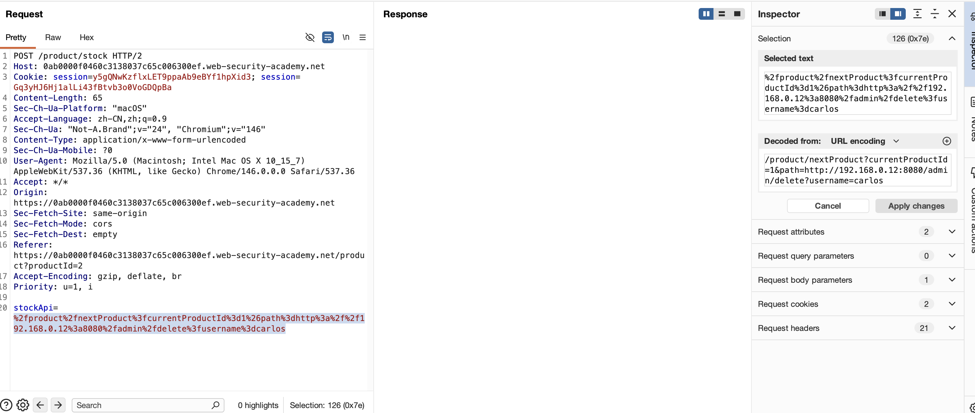 可以在重放器中选中被编码的目标,在URL面板直接修改为:http://localhost/admin,点击发送可以发现返回200,之后构建删除Carlos用户即可完成Lab,这是最基本的SSRF,不存在任何限制,你可以很直观看到这个过程,我们本身未登录,只有访客身份无法访问admin,但是经过Web架构的请求,我们的身份就变为了目标Web服务器,显然它有权限访问这个/admin进而实现SSRF攻击。