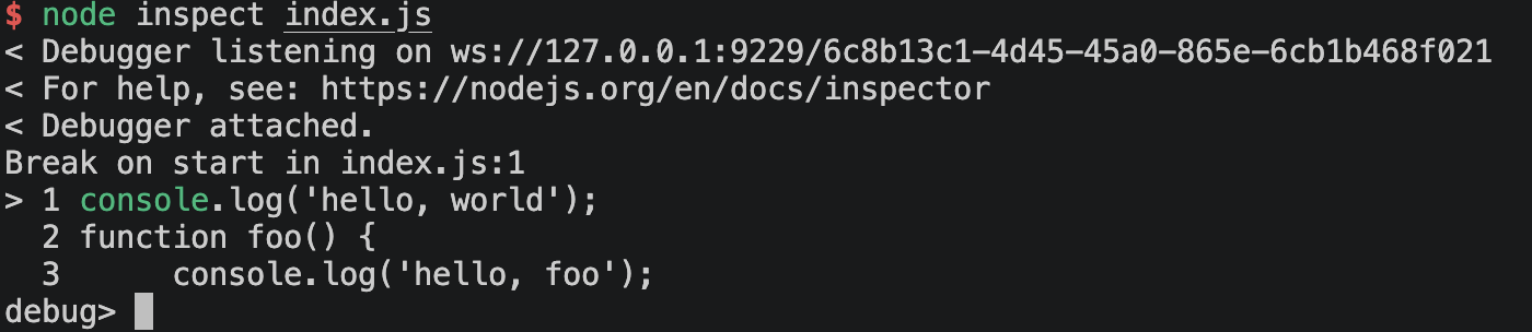 在命令行窗口中,可以使用"node inspect"命令来启用调试器,代码如下所示。