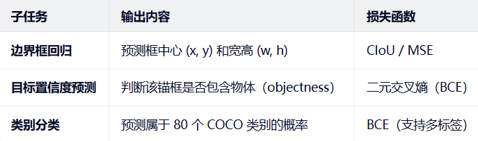 YOLOv3 是一个单阶段、多尺度、多任务的目标检测器。其训练目标可分解为三个子任务: