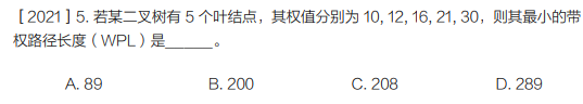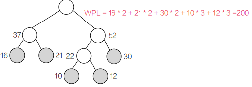 - WPL = 16×2 + 21×2 + 30×2 + 10×3 + 12×3 = 32 + 42 + 60 + 30 + 36 = 200(也可通过累加内部节点权值计算:22+38+59+89=200)