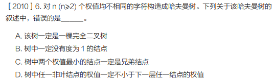 - C 正确:构造哈夫曼树时,权值最小的两个节点会被优先合并为兄弟节点。