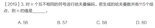 哈夫曼树的总节点数公式为 m=2n−1,代入 m=115:2n−1=115→2n=116→n=58