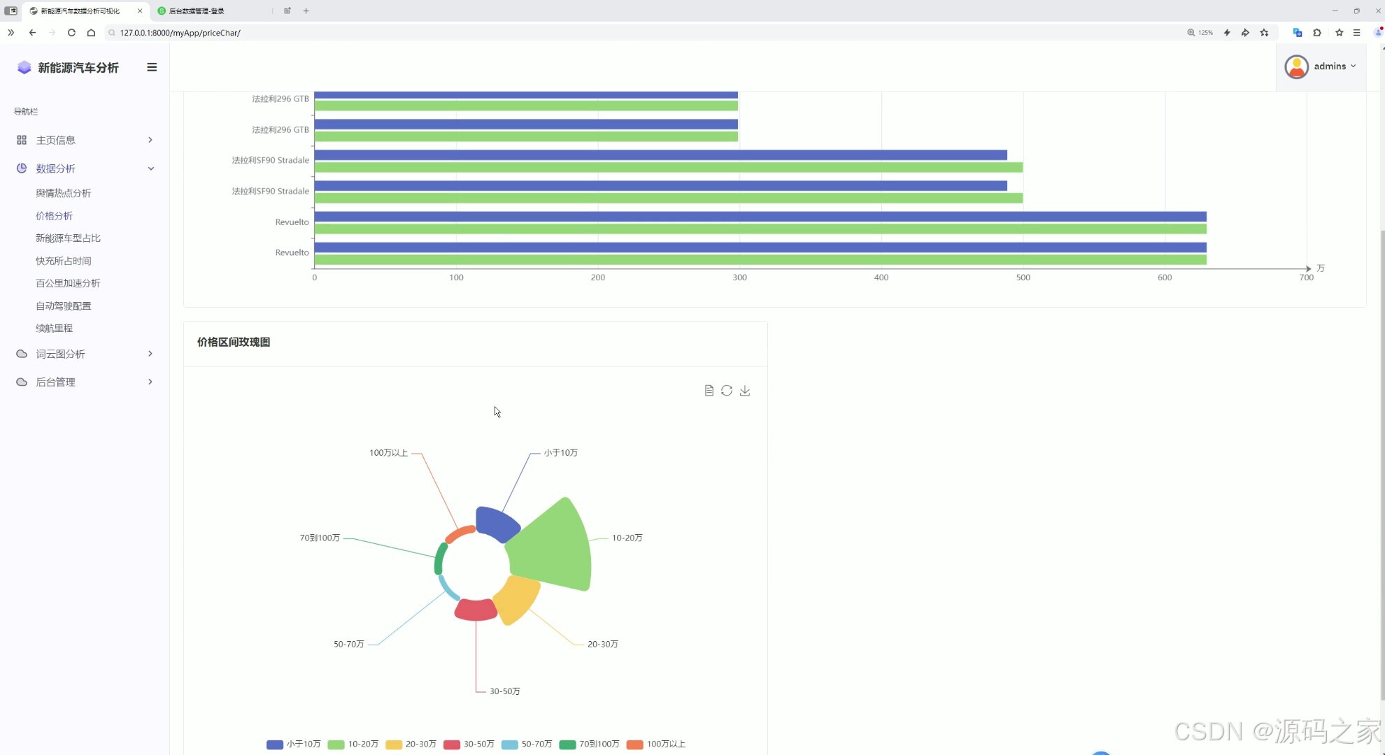 这是新能源汽车数据分析可视化系统的价格分析页面,左侧为包含主页信息、数据分析等模块的导航栏,主区域上方通过条形图展示不同车型的价格情况,下方以玫瑰图呈现各价格区间的车型分布,直观呈现新能源汽车的价格维度数据。