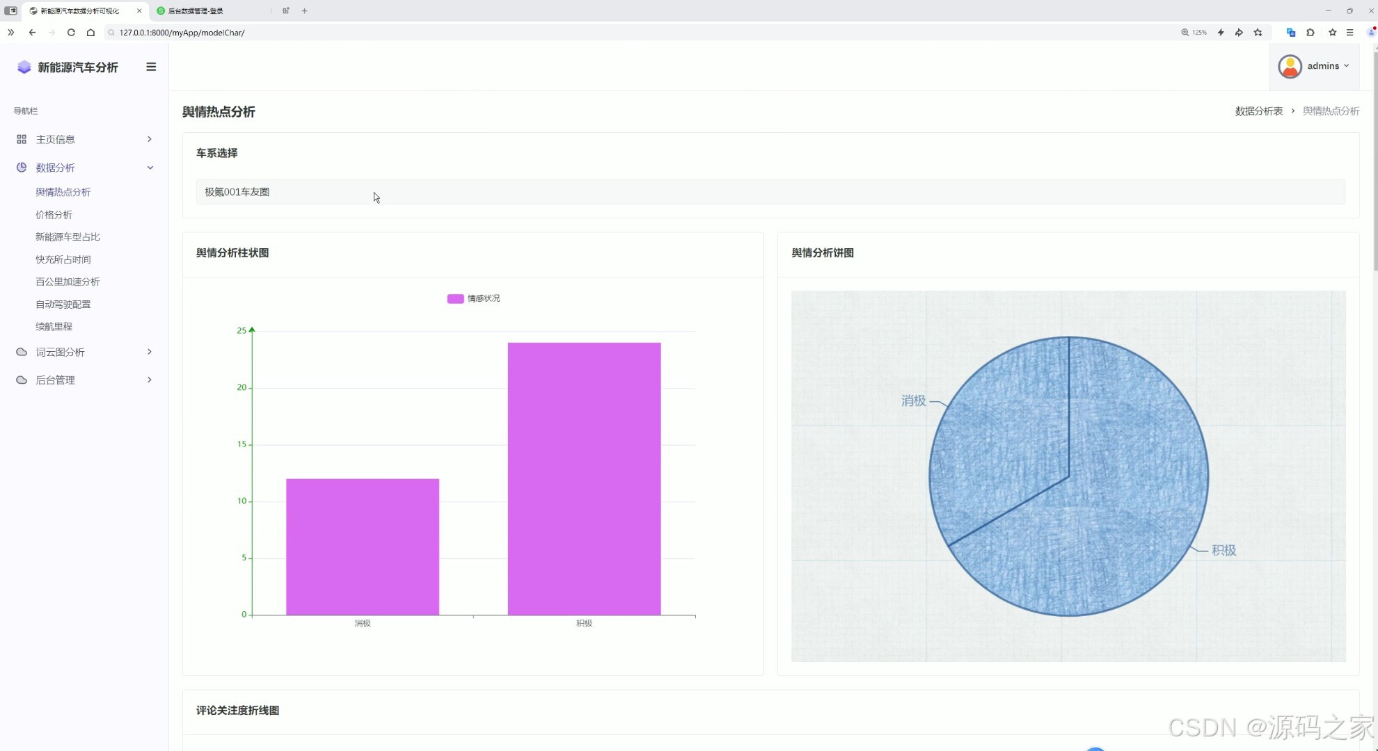 这是新能源汽车数据分析可视化系统的舆情热点分析页面,左侧为包含主页信息、数据分析等模块的导航栏,主区域支持车系选择,通过舆情分析柱状图和饼图展示对应车系的情感状况分布,直观呈现用户对车型的舆情反馈。