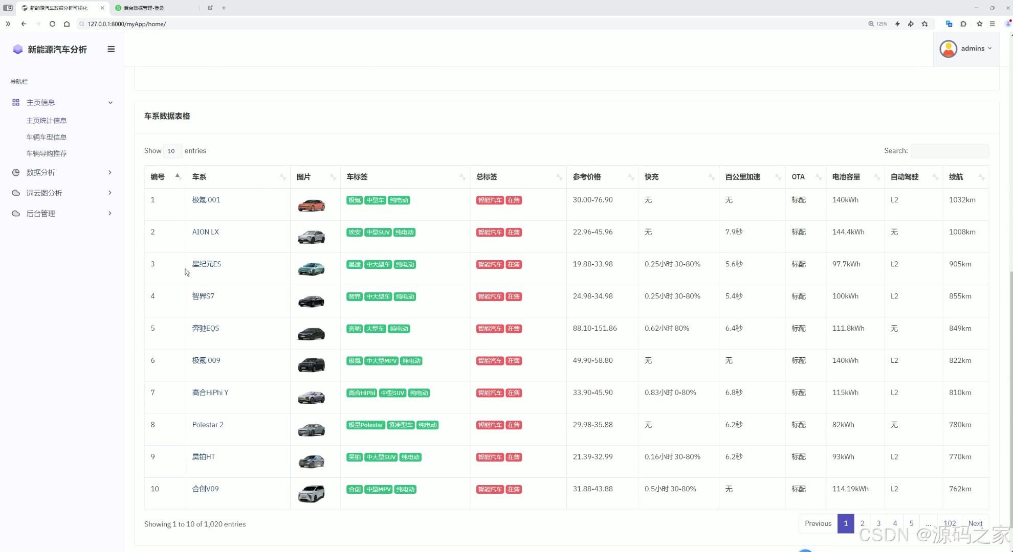 这是新能源汽车数据分析可视化系统的车辆车型信息页面,左侧为包含主页信息、数据分析等模块的导航栏,主区域展示车系数据表格,呈现各车型的详细参数信息,支持搜索、分页查看与条目数量调整,方便用户查询和管理车辆数据。