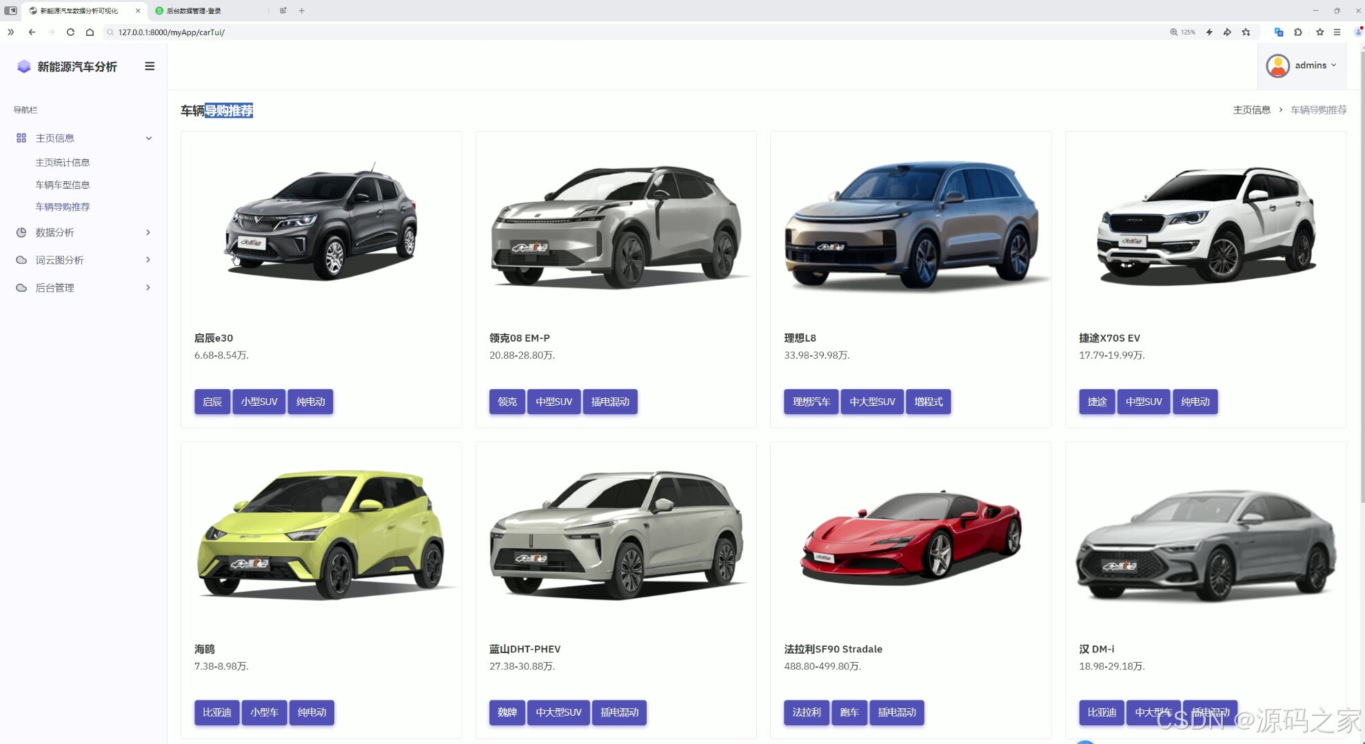 这是新能源汽车数据分析可视化系统的车辆导购推荐页面,左侧为包含主页信息、数据分析等模块的导航栏,主区域以卡片形式展示多款车型,呈现车辆外观、名称、价格及品牌、车型、动力类型等标签信息,为用户提供购车参考。