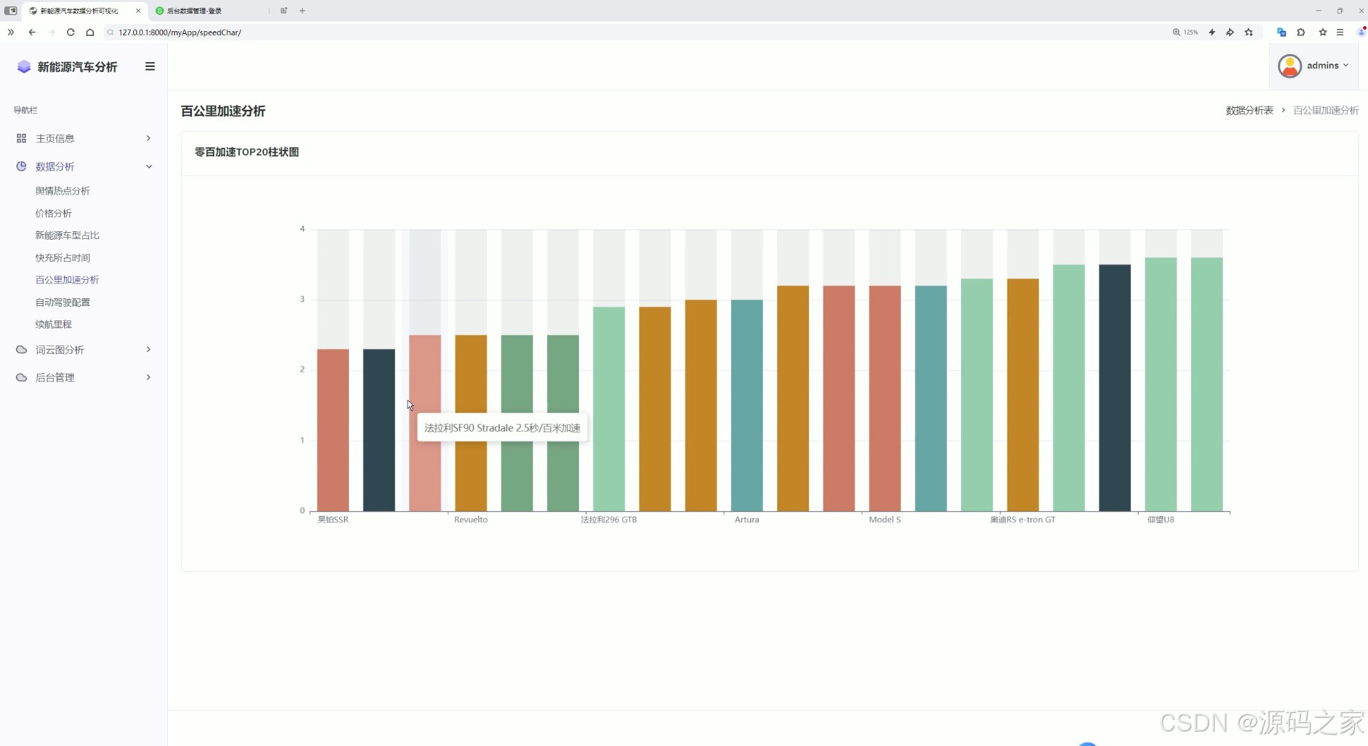 这是新能源汽车数据分析可视化系统的百公里加速分析页面,左侧为包含主页信息、数据分析、词云图分析、后台管理等模块的导航栏,主区域展示零百加速TOP20柱状图,直观呈现不同车型的百公里加速性能表现,方便用户对比各车型的动力性能。