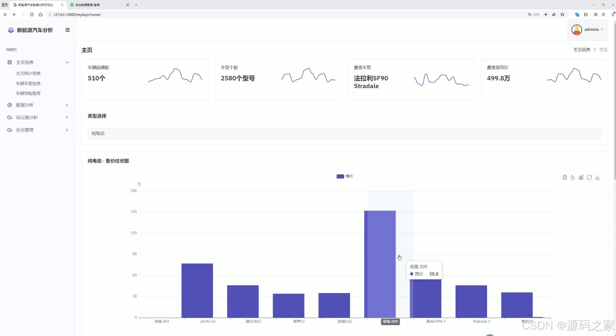 这是新能源汽车数据分析可视化系统的主页,左侧为导航栏,包含主页信息、数据分析、词云图分析、后台管理等功能入口,页面上方展示车辆相关统计信息,支持车辆类型选择,下方呈现对应类型车辆的售价柱状图,可直观查看不同车型的售价情况。